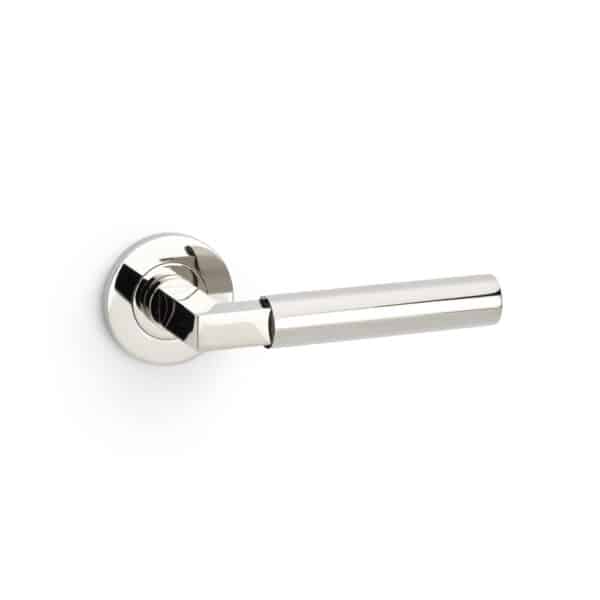 The Hurricane door handle features a modern plain barrel lever, against a square silhouette, finished with a plain round rose. This contemporary lever door handle contrasts square and cylindrical shapes, creating a bold yet uncomplicated statement.
