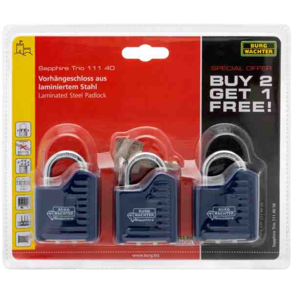 The Sapphire 111 Trio offers three 40mm padlocks, all which work with the same key.